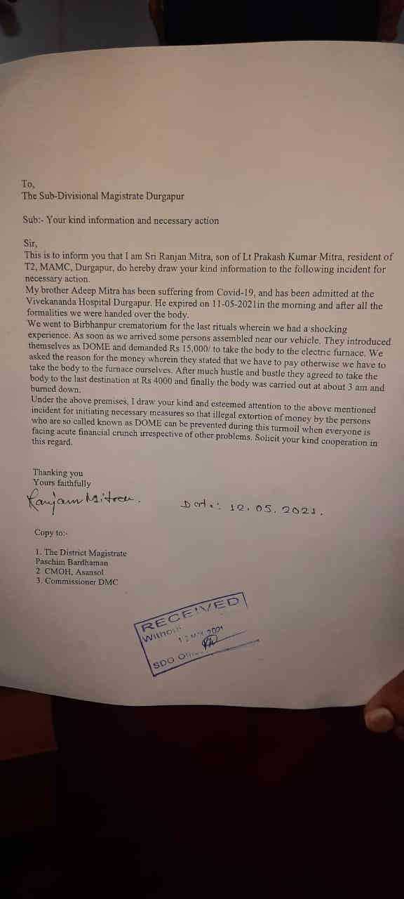 দুর্গাপুরের মেয়র দিলীপ অগোস্থি নিজেই কোভিডে আক্রান্ত হয়ে হাসপাতালে ভর্তি রয়েছেন তাঁকে ফোনে বিষয়টি জানানোর পর তিনি বলেন দুর্গাপুর কে বদনাম করার জন্য শ্মশানের দায়িত্ব যে মেয়র পরিষদ এর রয়েছে তার কোনো হেলদোল নেই এই কালোবাজারি বন্ধ করার। স্থানীয় কাউন্সিলর ওই ব্যাপারে কোনো হস্তক্ষেপ করছে না কেন সেগুলো তদন্ত হওয়া দরকার রয়েছে।
